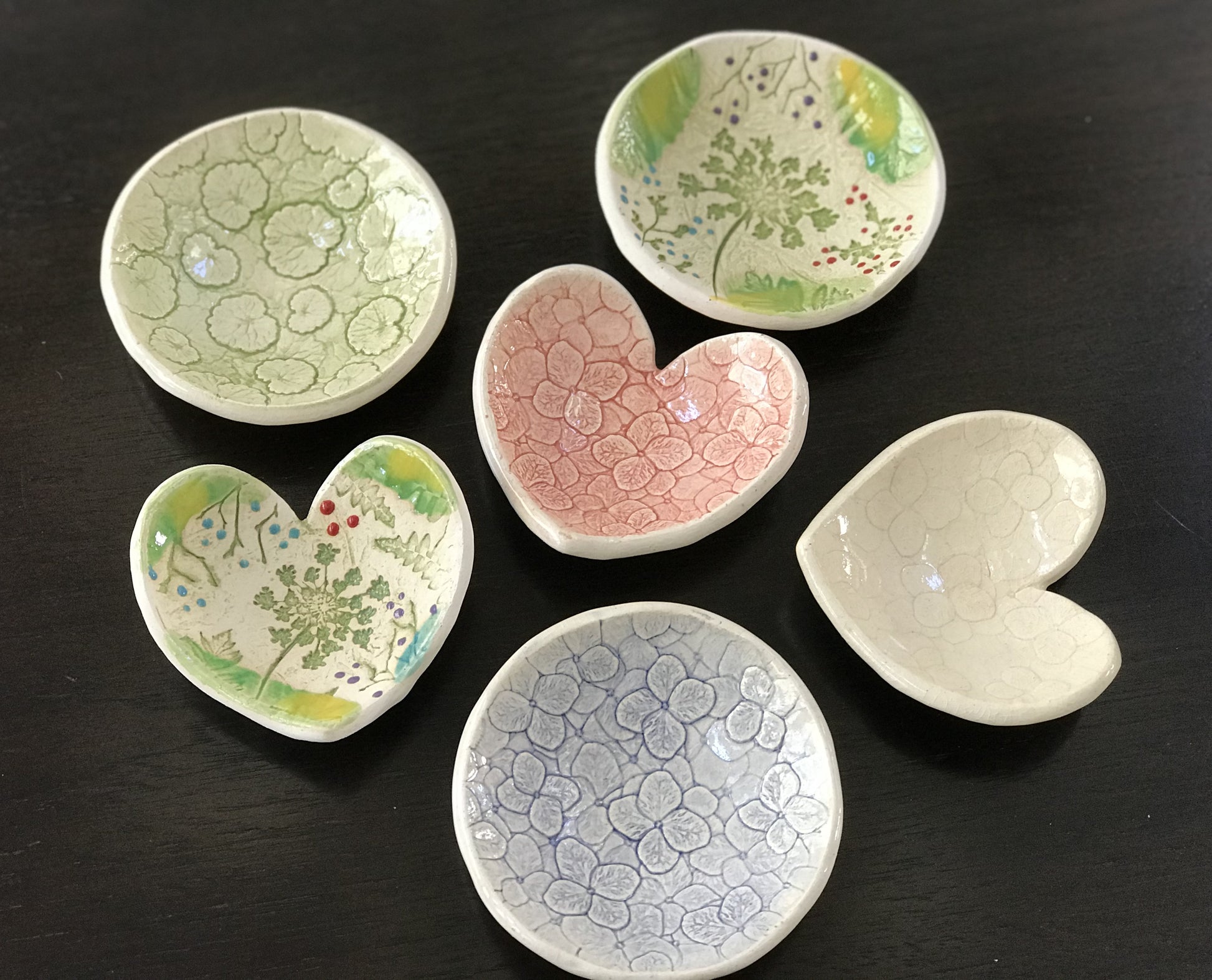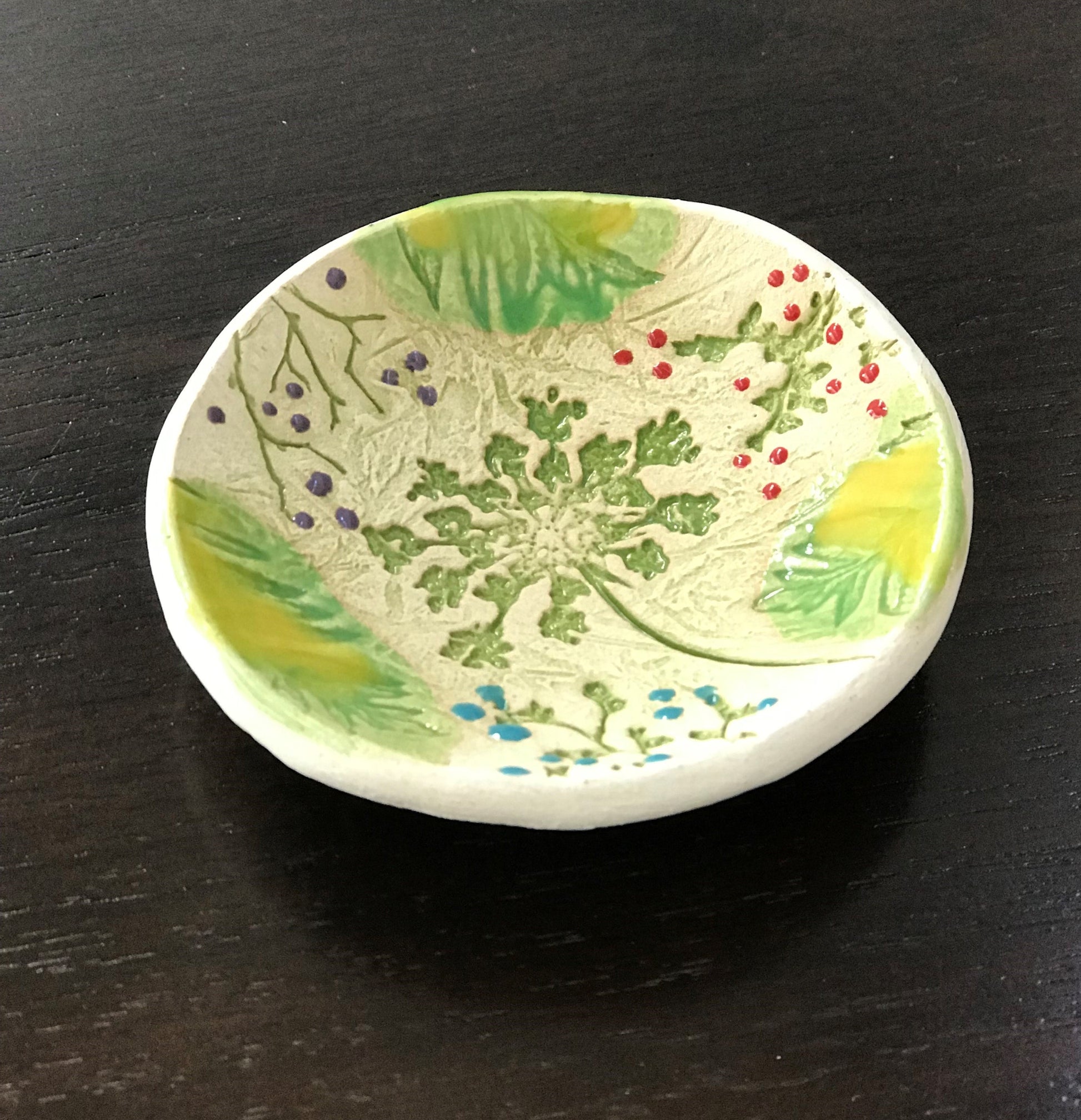 Handmade from earthenware clay and impressed with native plants and greenery and decorated with food safe glazes of green, gold, turquoise, purple, and a touch of red.
